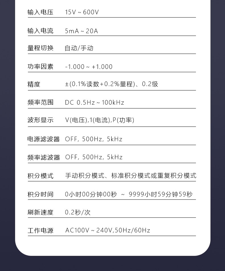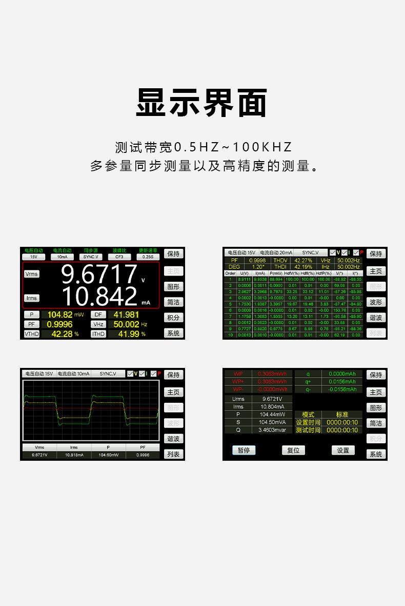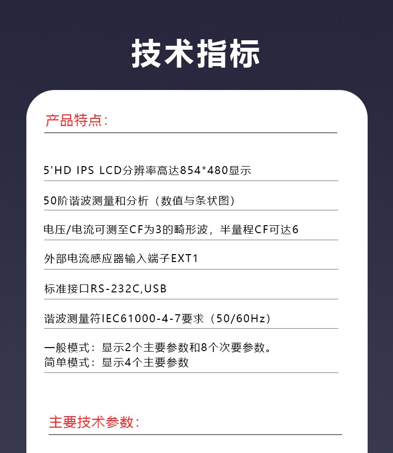 5'HDIPSLCD分辨率高達(dá)854*480 DC.0.5HZ-100kHZ電壓/電流測(cè)試帶帶寬波形顯示:V電壓、1電流、P功率電壓/電流可測(cè)至CF為3的畸形波,半量程CF可達(dá)650階諧波測(cè)量和分析(數(shù)值與條狀圖)外部電流感應(yīng)器輸入端子EXT1標(biāo)準(zhǔn)接口RS-232C,USB 諧波測(cè)量符IEC61000-4-7要求(50/60Hz)兩種數(shù)值顯示模式 般模式:顯示2個(gè)主要參數(shù)和8個(gè)次要參數(shù)簡(jiǎn)單模式:顯