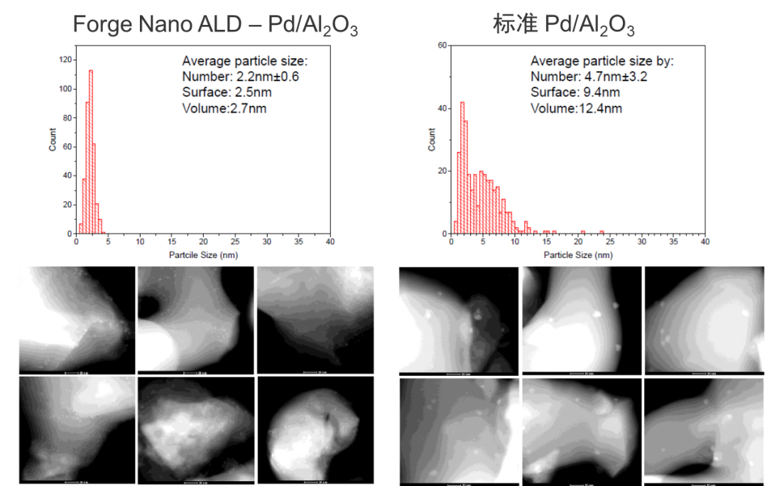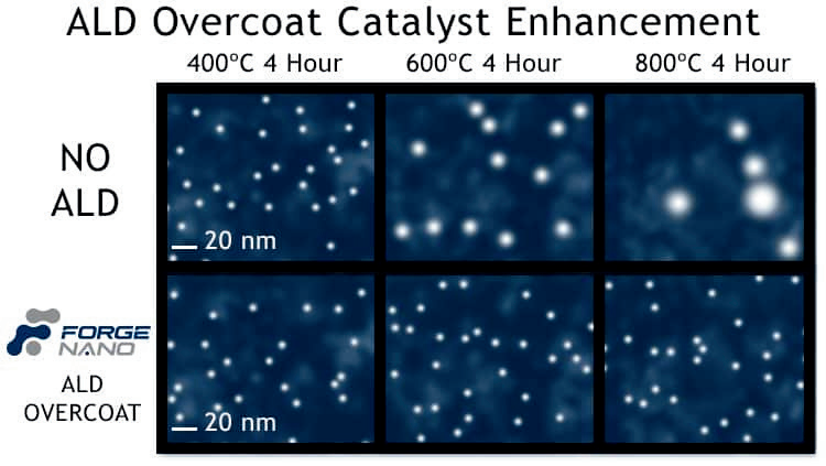 使用 Forge Nano 包覆后的催化劑(左),未包覆的催化劑(右)