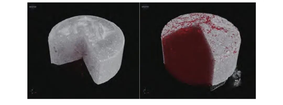 但通過分析制劑的孔隙率(片劑表觀體積中,除原輔料外,內(nèi)部的孔隙占總體積的比例),發(fā)現(xiàn)溶出不合格樣品的孔隙率遠(yuǎn)大于參比制劑,分別為 32.851%(仿制制劑)和 6.545%(參比制劑),見下圖(圖中白色部分代表主藥和輔料, 紅色部分代表孔隙)。從結(jié)構(gòu)對比結(jié)果推測,溶出度不合格樣品可能是由于孔隙率偏大,因而能迅速吸收大量水分,由于重力作用而沉積在普通溶出杯底部。