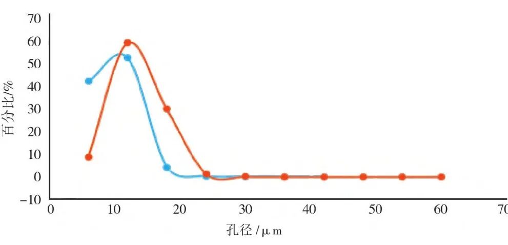 圖注:參比制劑樣品(藍(lán)色)和溶出度不合格樣品(橘色)的局部孔徑大小分布